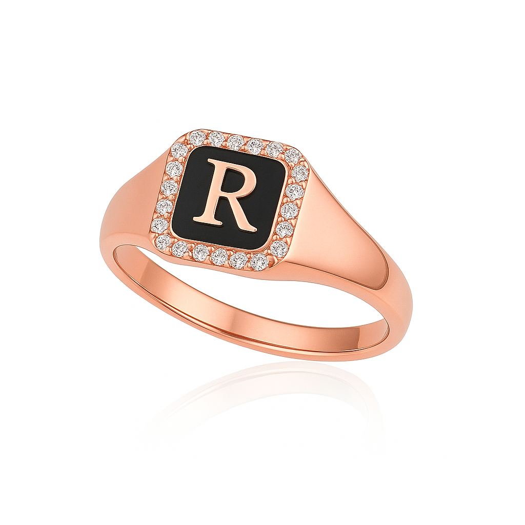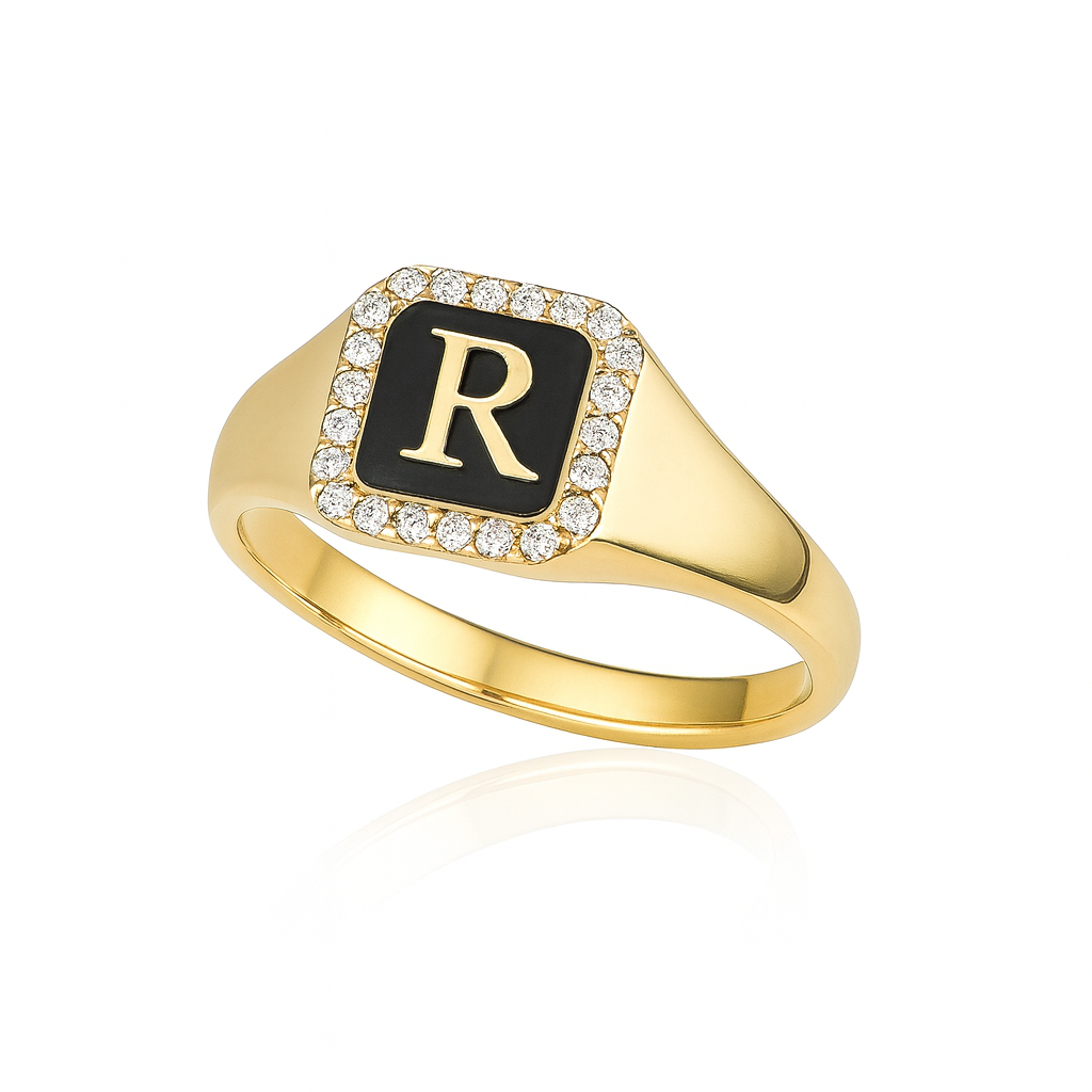 עם משטח חותם באמייל שחור מרכזי ועליו אות לבחירה מוזהבת.