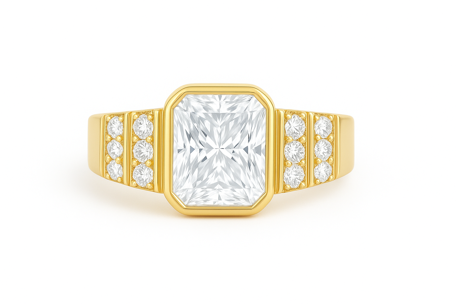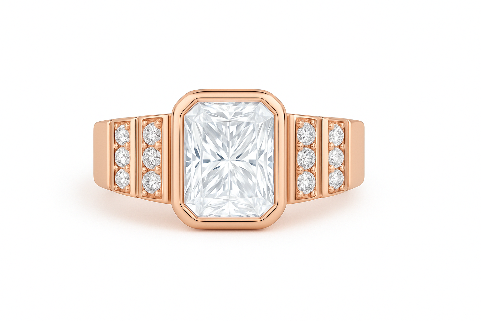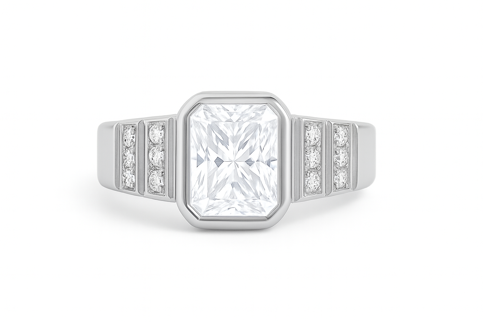 בשני צידי היהלום המרכזי משובצות שורות יהלומים קטנים, המוסיפים ברק, עומק ועושר לעיצוב.