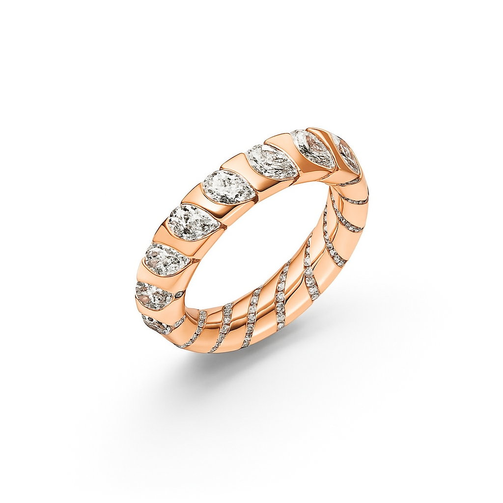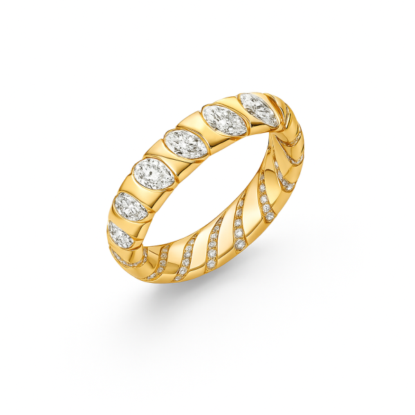 מעוררת השראה עם נוכחות מרשימה עשויה זהב בגימור מבריק, ומשובצת יהלומים בחיתוך טיפה , מרקיזה ועגולות היוצרים טקסטורה זורמת ויוקרתית מסביב לכל היקף הטבעת.