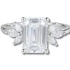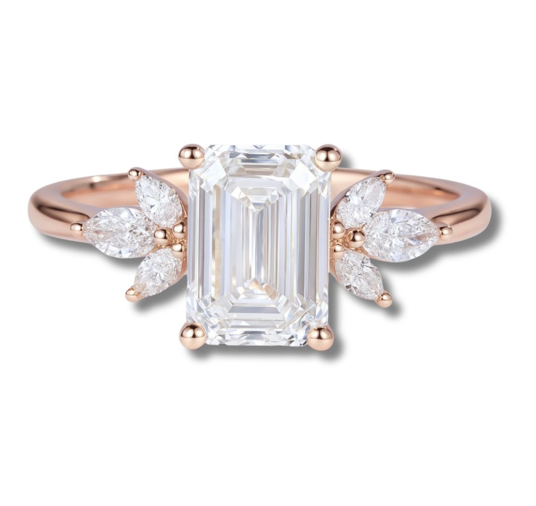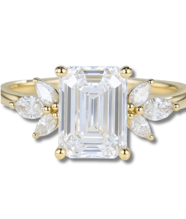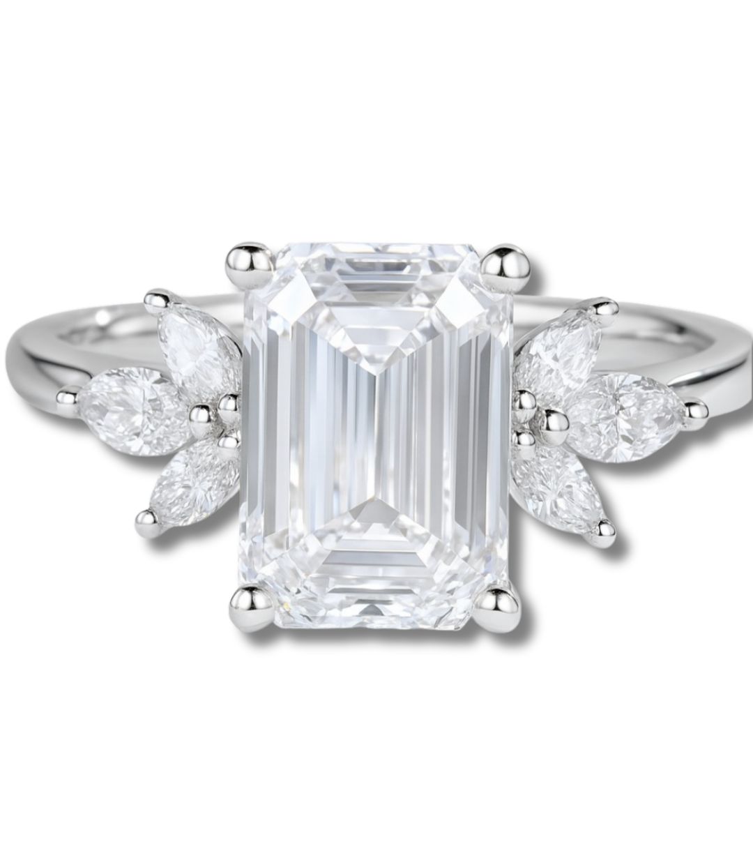 במרכזה יהלום בחיתוך אמרלד בעל מראה נקי, סימטרי וזוהר במיוחד.
