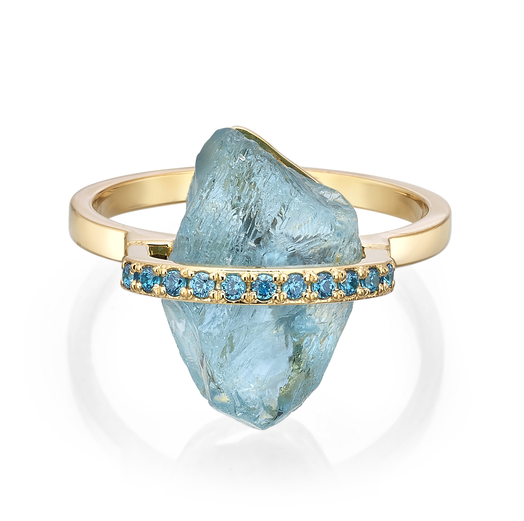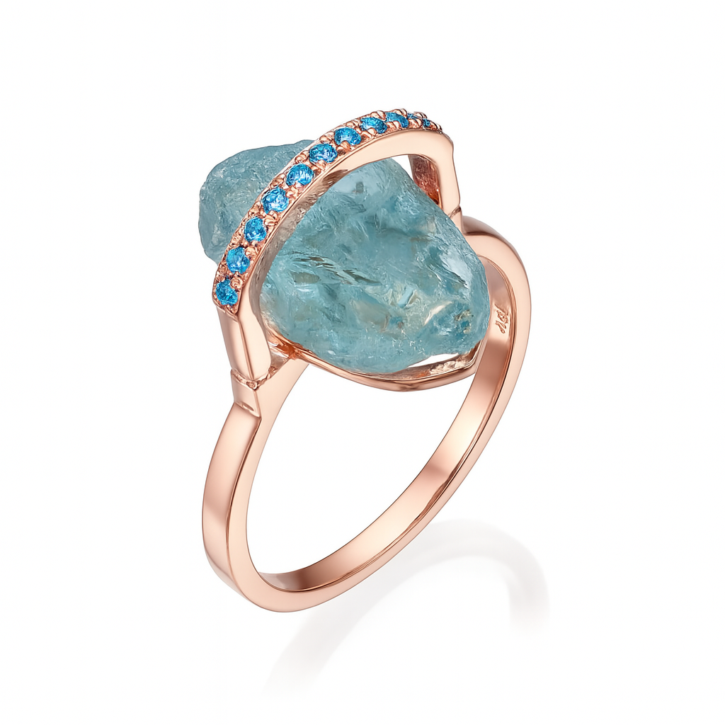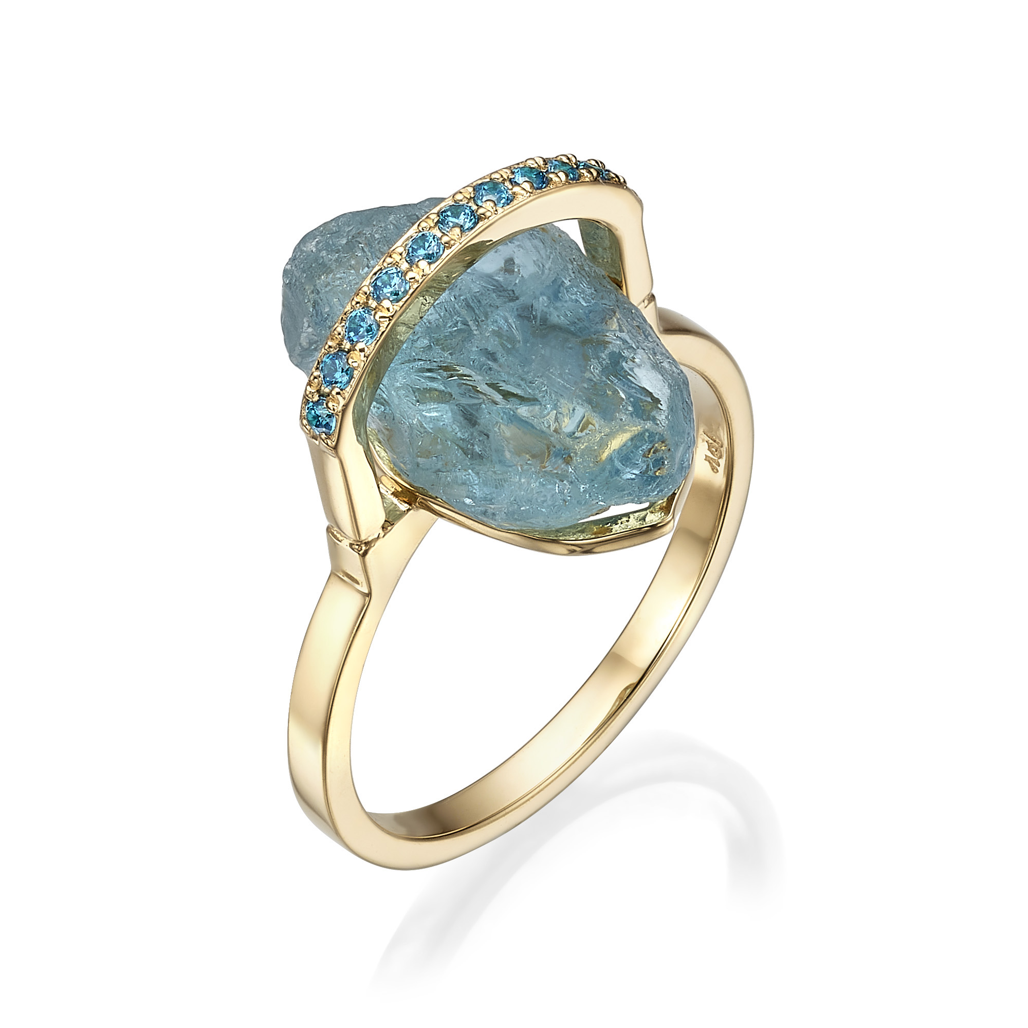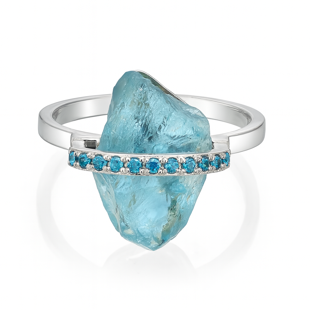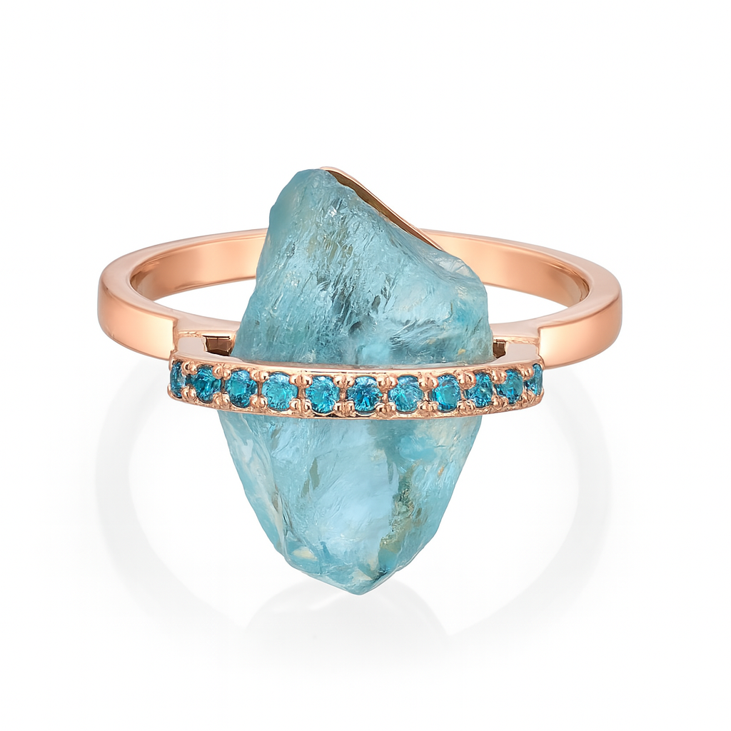 במרכזה שיבוץ של אבן טבעית בגימור גולמי, המשדרת עוצמה וטבעיות. האבן מוקפת בשורת יהלומים כחולים קטנים ומבריקים, השוברים את האור באופן מהפנט ומוסיפים נגיעה יוקרתית.