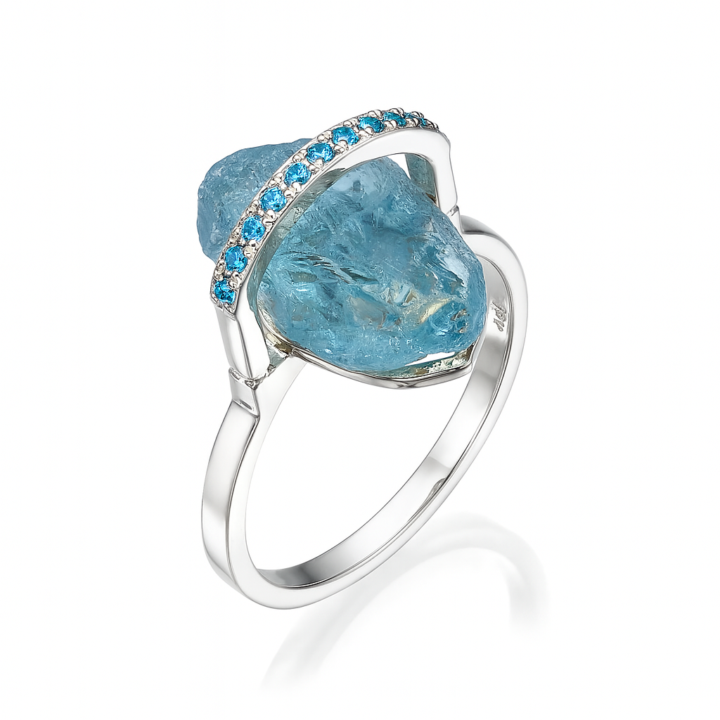 טבעת זהב לבן עם אבן גולמית ויהלומים כחולים