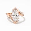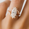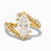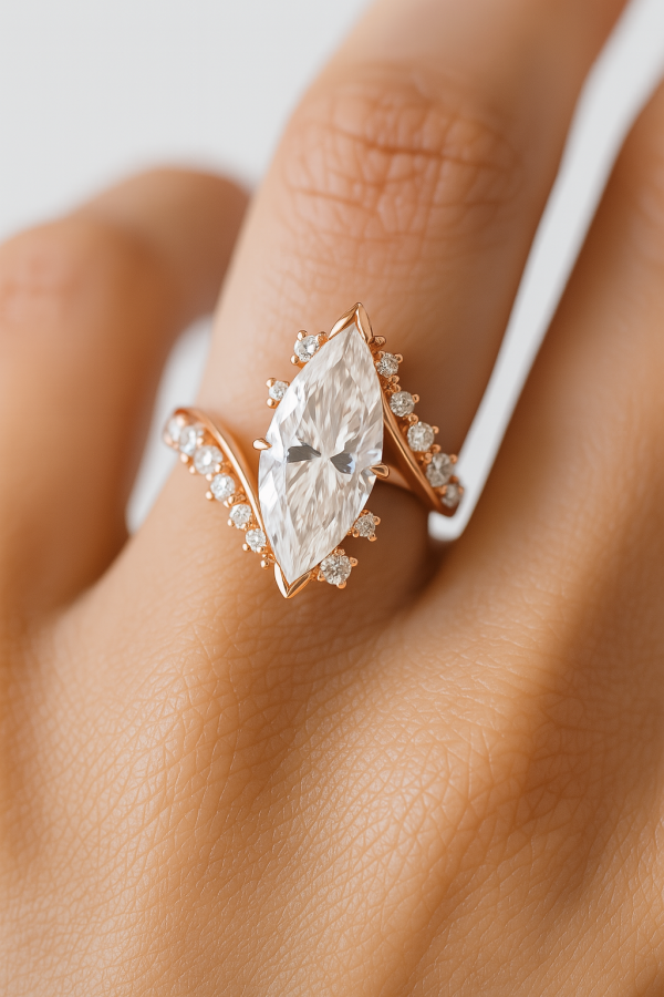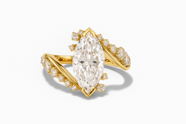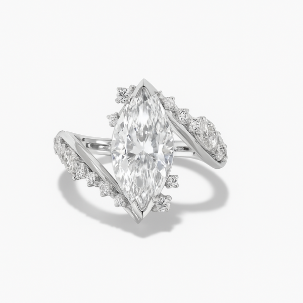 העיצוב הפתוח והמעוגל עוטף את האצבע בעדינות, כששתי זרועות משובצות יהלומים קטנים מובילות אל מרכז הטבעת – יהלום מרהיב בגימור מושלם בחיתוך מרקיזה.