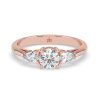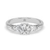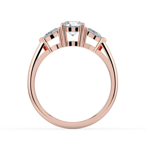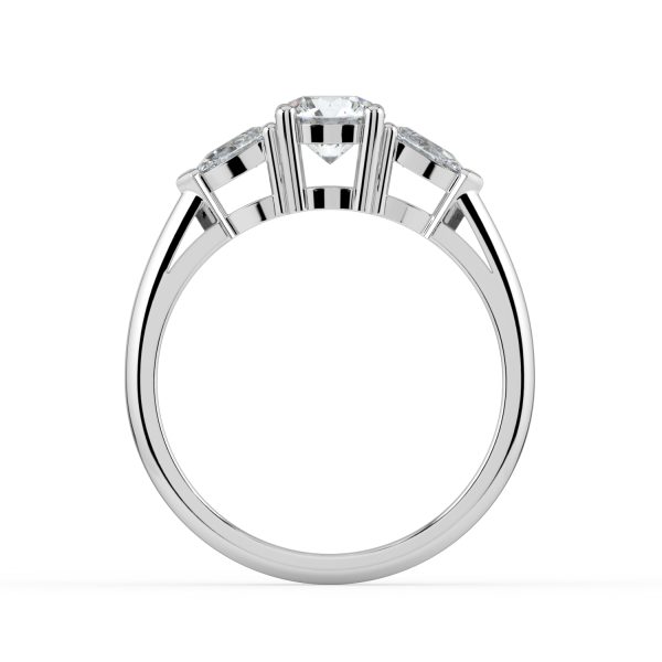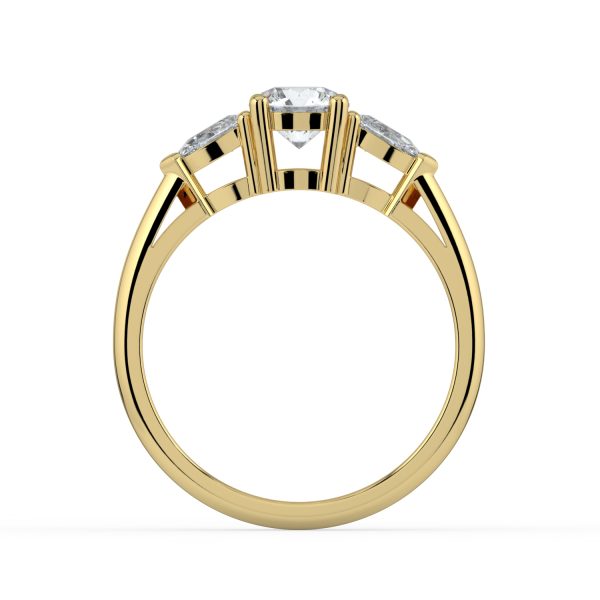 טבעת אלגנטית ומדויקת המשלבת יהלום עגול מרכזי בעל ברק יוצא דופן, ולצידו שני יהלומים בחיתוך טיפה המוסיפים טאצ' עדין של אלגנטיות ורוך.