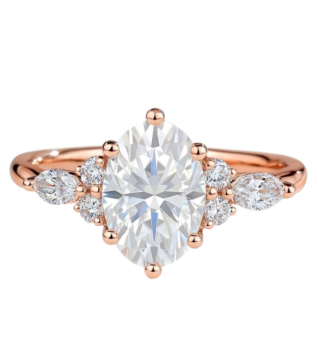 היהלום המרכזי מוקף בעיטור עדין בצורת עלים, המורכב מיהלומים בחיתוך עגול ומרקיזה , היוצרים יחד קומפוזיציה פרחונית זוהרת ונשית במיוחד.