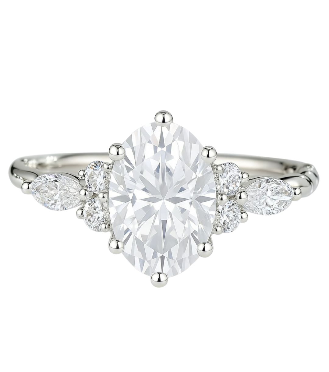 טבעת זהב עם יהלום בחיתוך אובלי ועיטור צד פרחוני