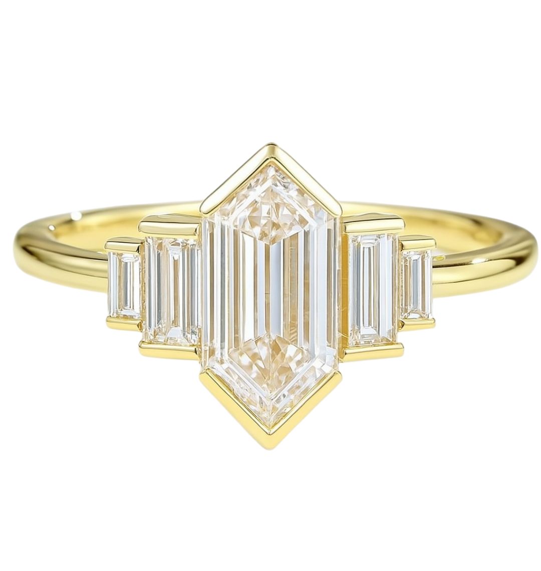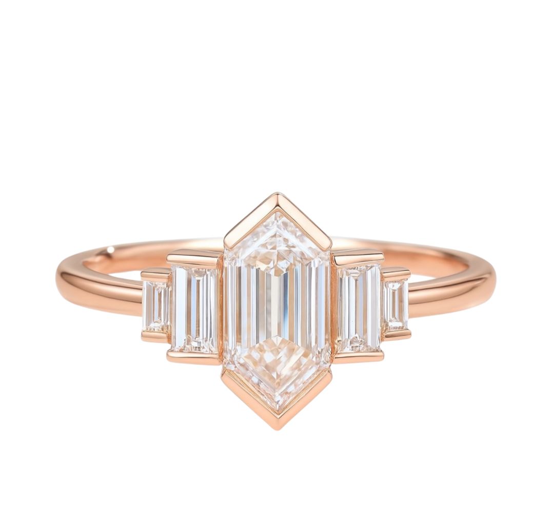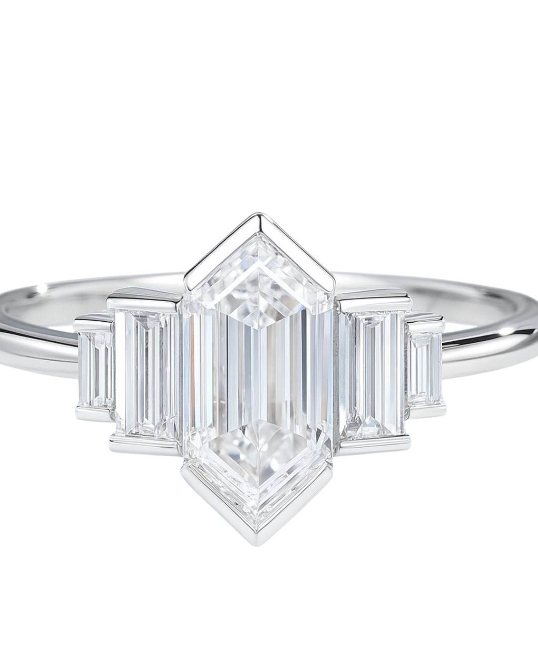 במרכזה ניצב יהלום מרכזי בחיתוך אמרלד ייחודי בצורת משושה מוארכת, עם שוליים חדים ופאות ישרות שמייצרות אפקט מראה עמוק ומרהיב.