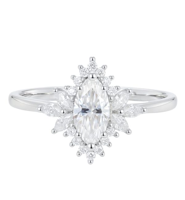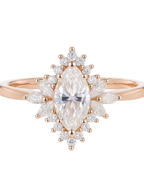 מסביב ליהלום המרכזי מתפרשת מסגרת מרהיבה של יהלומים קטנים עגו.לים ויהלומי מרקיזה קטנים נוספים, המשובצים בצורה הרמונית ליצירת אפקט מרהיב ונוצץ .