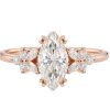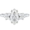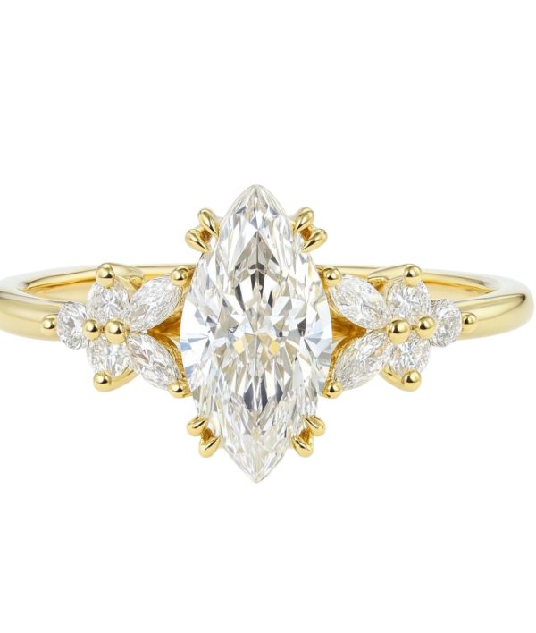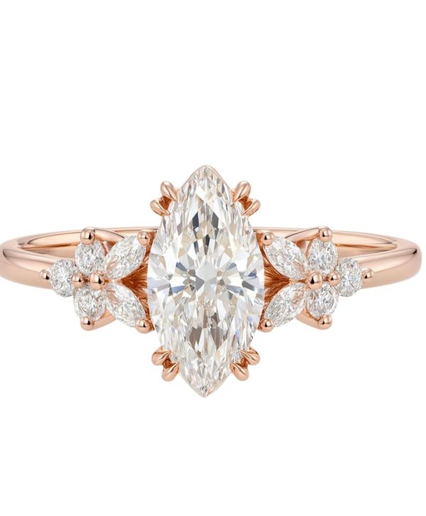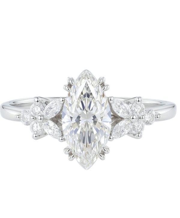 משני צדי היהלום המרכזי משובצים אשכולות יהלומים בגזרות מרקיזה ועגולה, הערוכים בדוגמה פרחונית מעודנת. הסידור המדויק של כל יהלום קטן יוצר אשליה של פריחה סביב האבן המרכזית – כאילו היהלום נולד מתוך פרח פתוח .