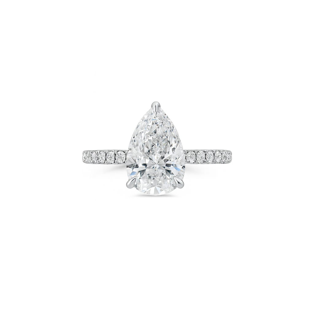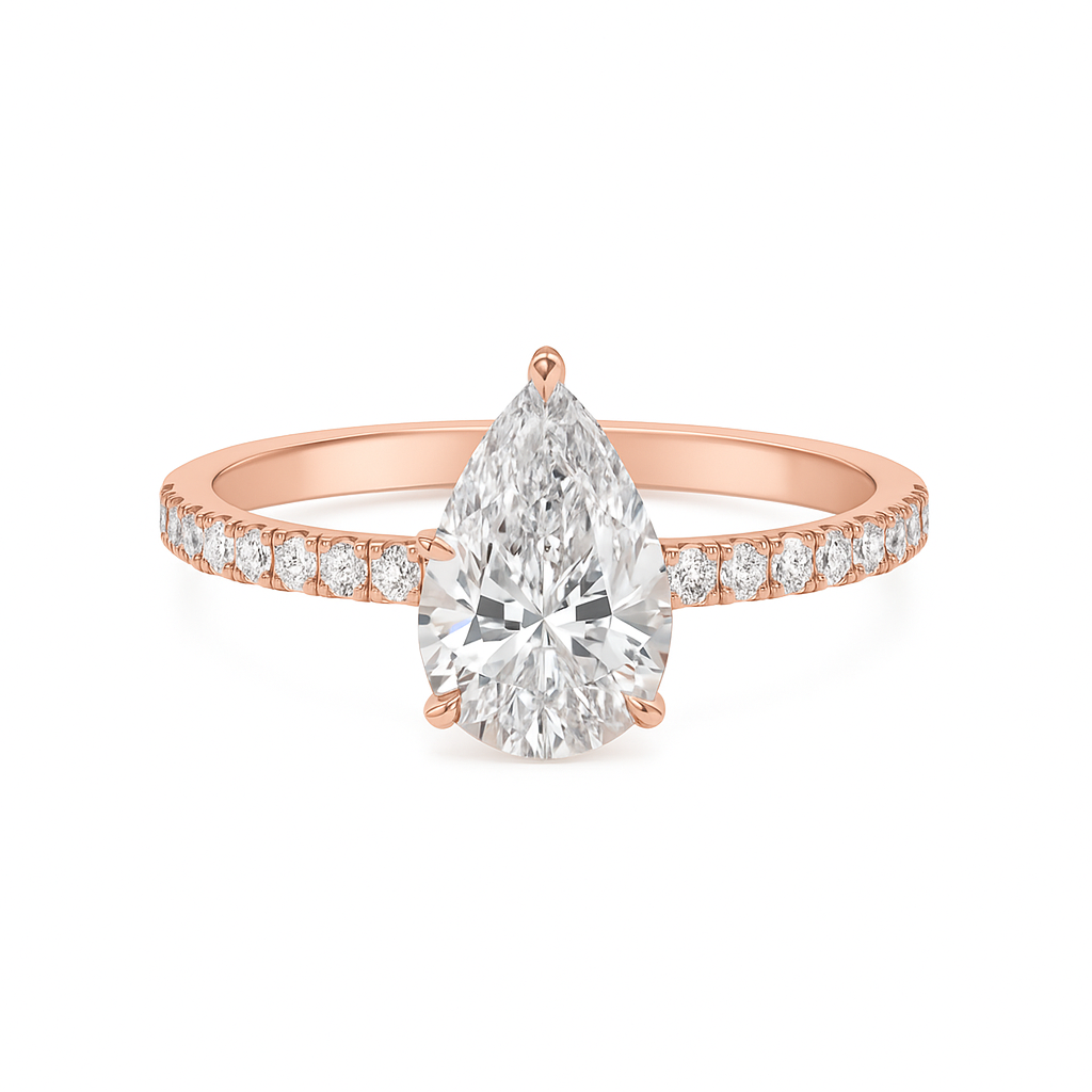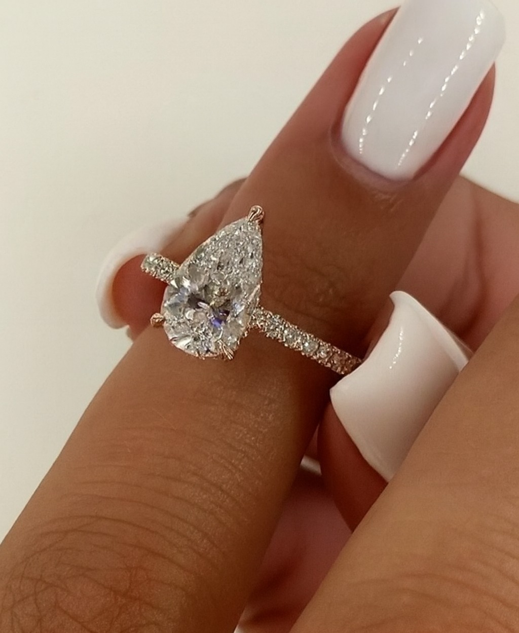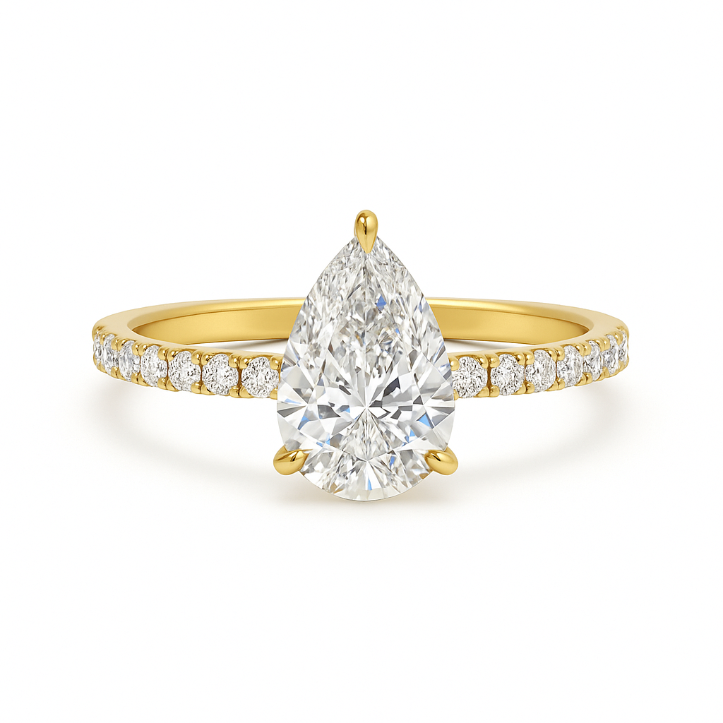 טבעת יוקרתית ומרשימה מתאימה גם כטבעת אירוסין עם יהלום מרכזי בצורת טיפה, המשובץ על גבי טבעת זהב מעודנת.