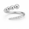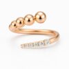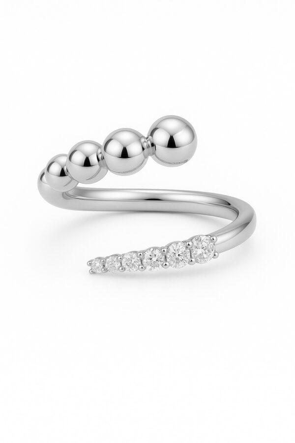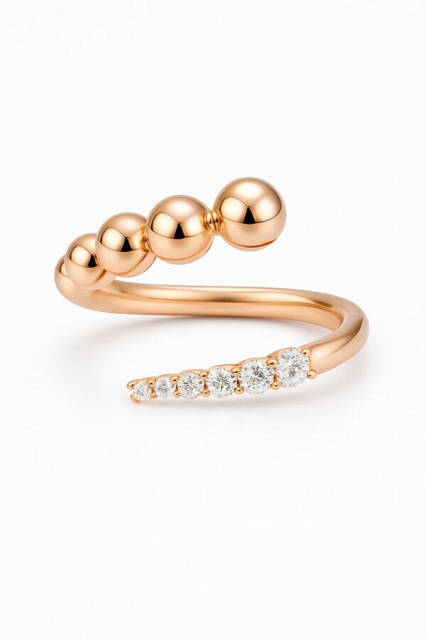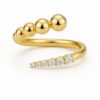 טבעת פתוחה בעיצוב מודרני ואלגנטי, המשלבת שני אלמנטים מנוגדים בהרמוניה מושלמת: כדורי זהב חלקים ובוהקים לצד שורת יהלומים עגולים נוצצים.