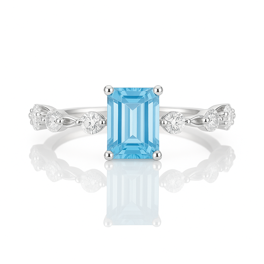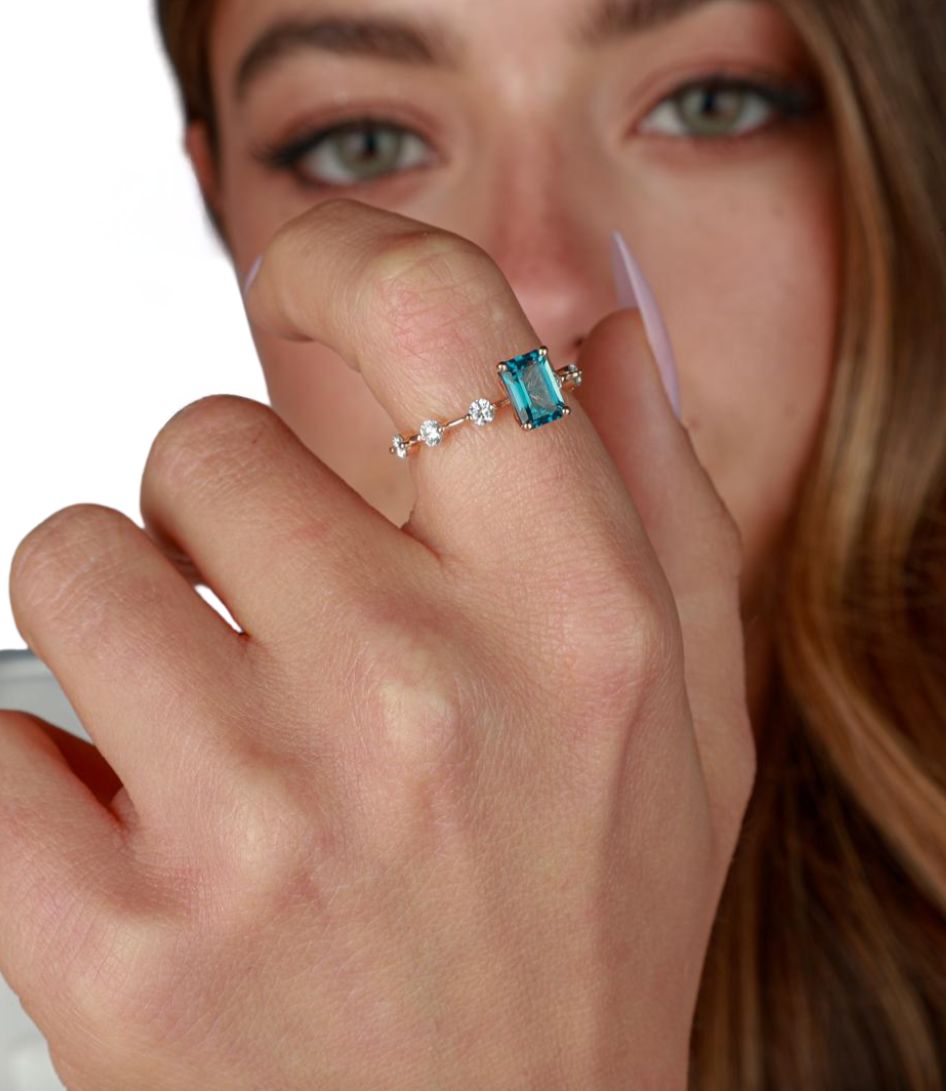שילוב היהלומים והנוכחות האלגנטית של האבן המרכזית וצבעה המיוחד יוצר מראה אלגנטי, מודרני ועל-זמני.