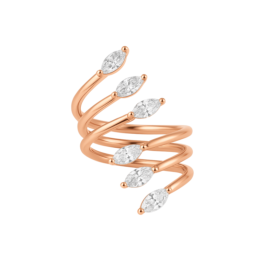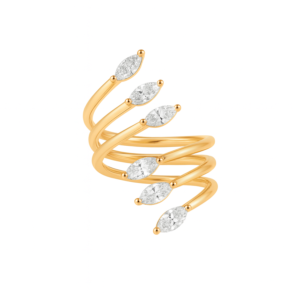 טבעת מרהיבה בעיצוב ספירלה אלגנטי, עשויה זהב 14K ומשובצת ביהלומים בצורת מרקיזה (Marquise) משני צידי הטבעת.