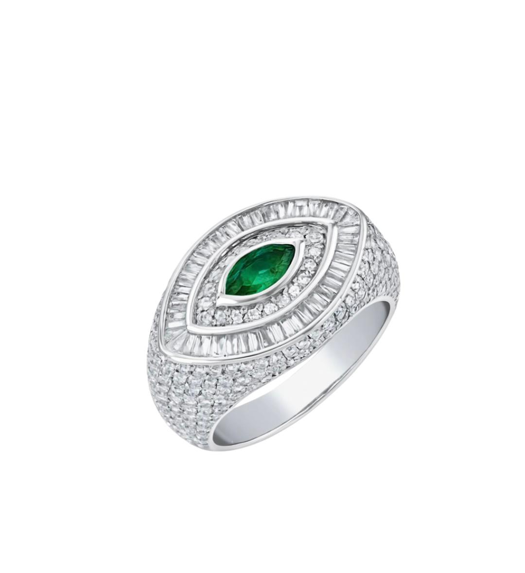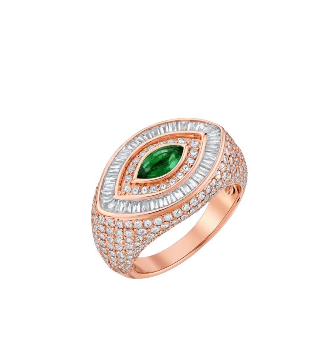 טבעת מהפנטת בעיצוב עין עשויה זהב צהוב ומעוטרת באבן חן ירוקה בליטוש מרקיזה במרכזה.