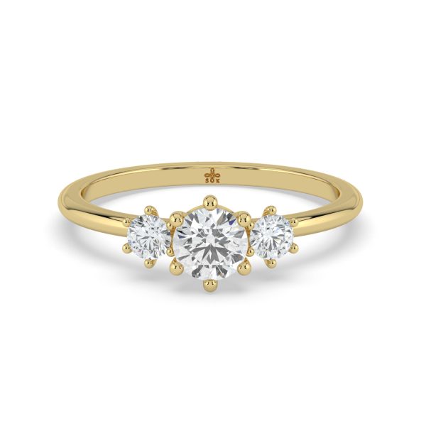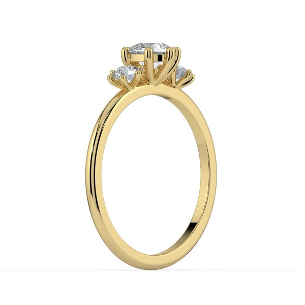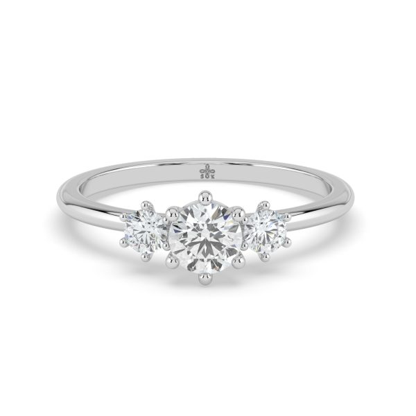 טבעת קלאסית יוקרתית בעיצוב של שלושה יהלומים, המשלבת יהלום מרכזי עגול וגדול ושני יהלומים עגולים קטנים יותר בצדדים.
