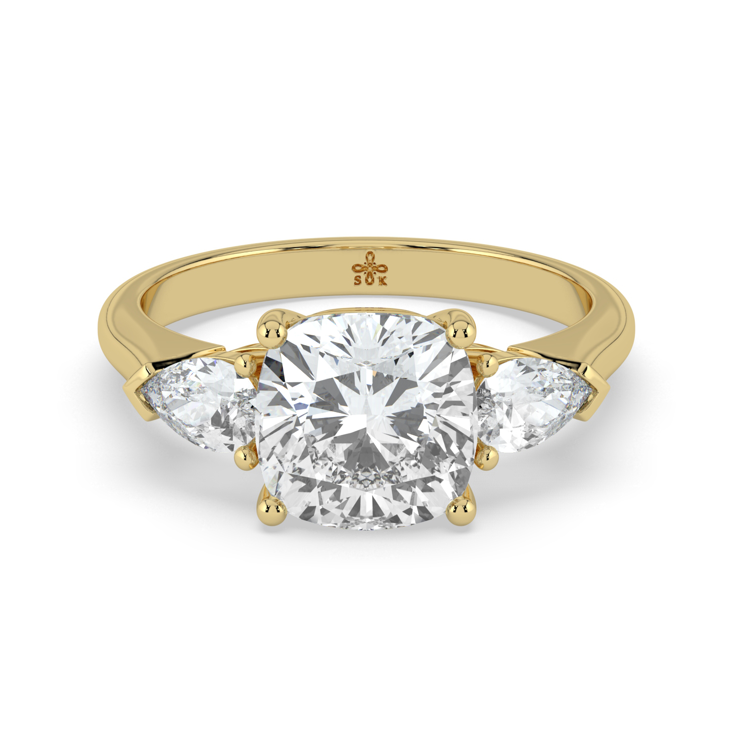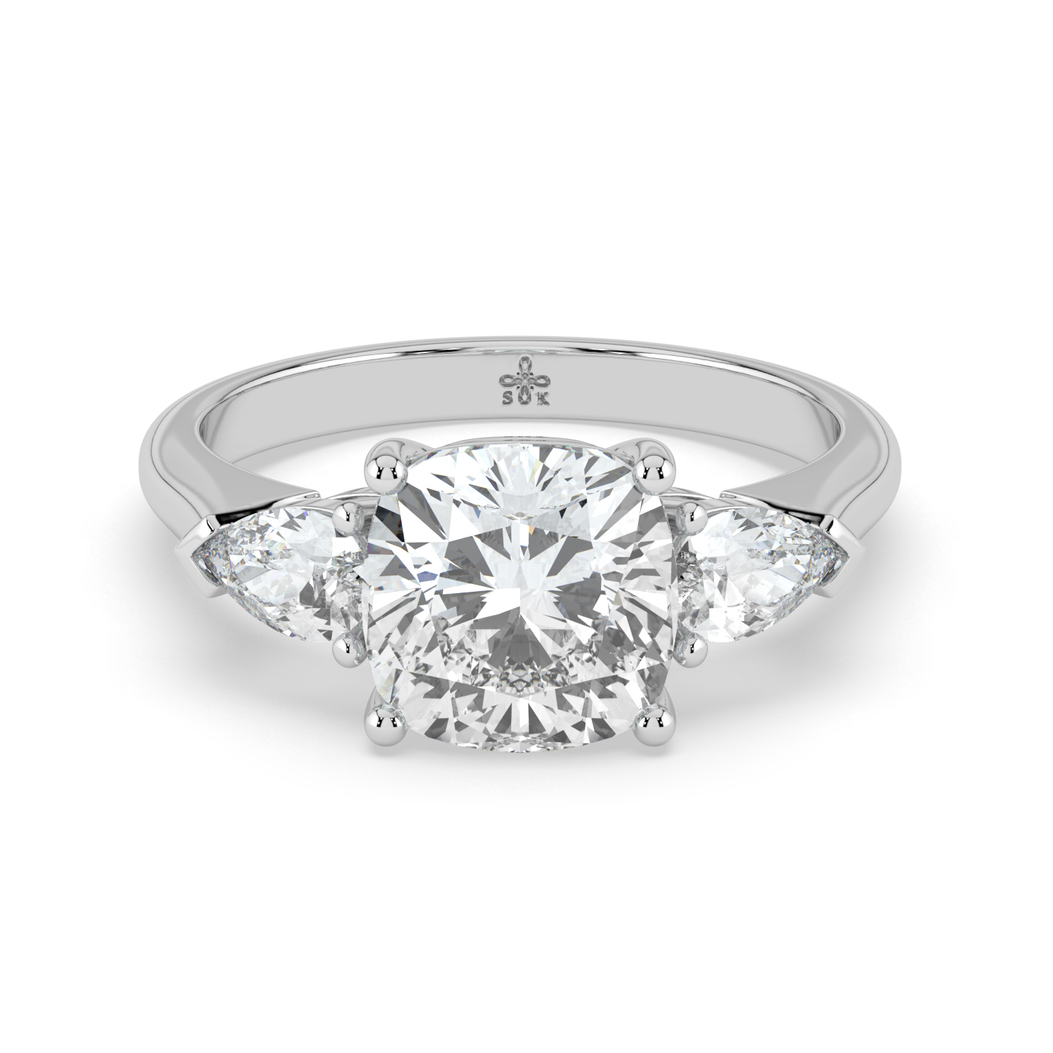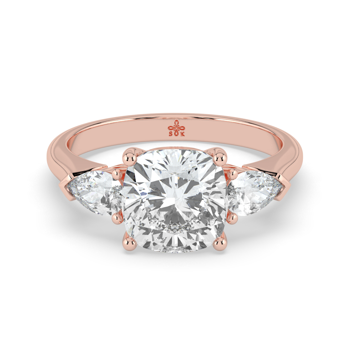 טבעת יהלומים משולשת – יהלום מרכזי Cushion ולצידו שני יהלומי טיפה
