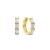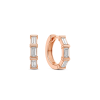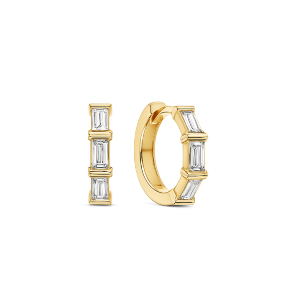 זוג עגילי חישוק בעיצוב מודרני ומוקפד, עשויים זהב בגימור מבריק. כל עגיל משובץ בשלושה יהלומים טבעיים/מעבדה בחיתוך באגט סה"כ 0.60 ct