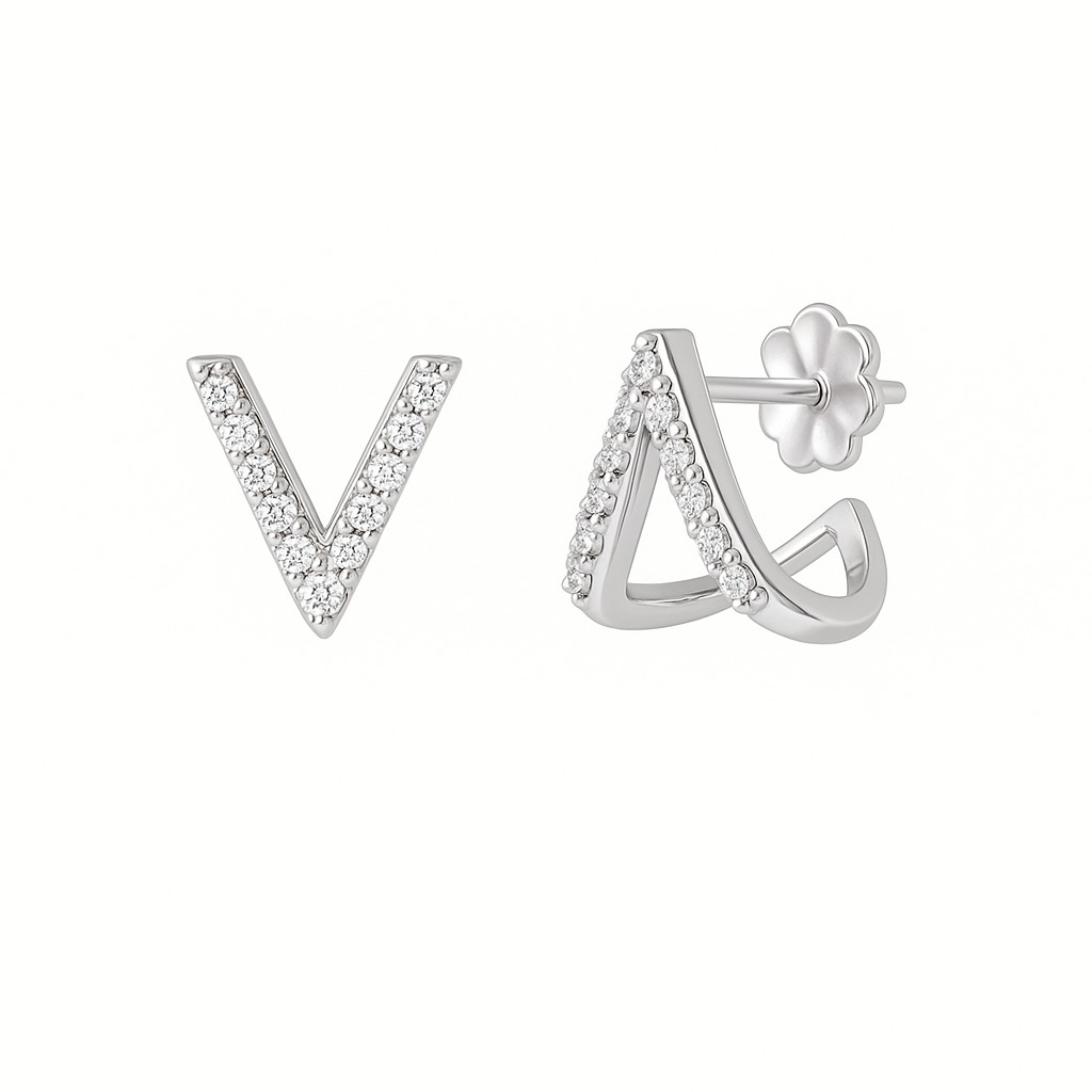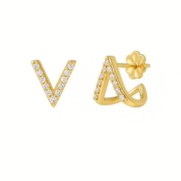 עגילי סטאד ייחודיים בעיצוב אות V, מזהב אדום 14K, משובצים יהלומים עגולים נוצצים לכל אורכם.