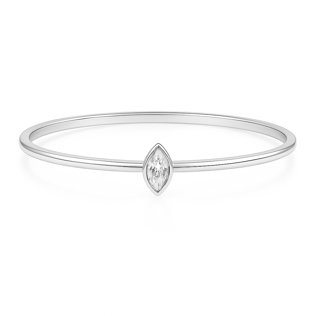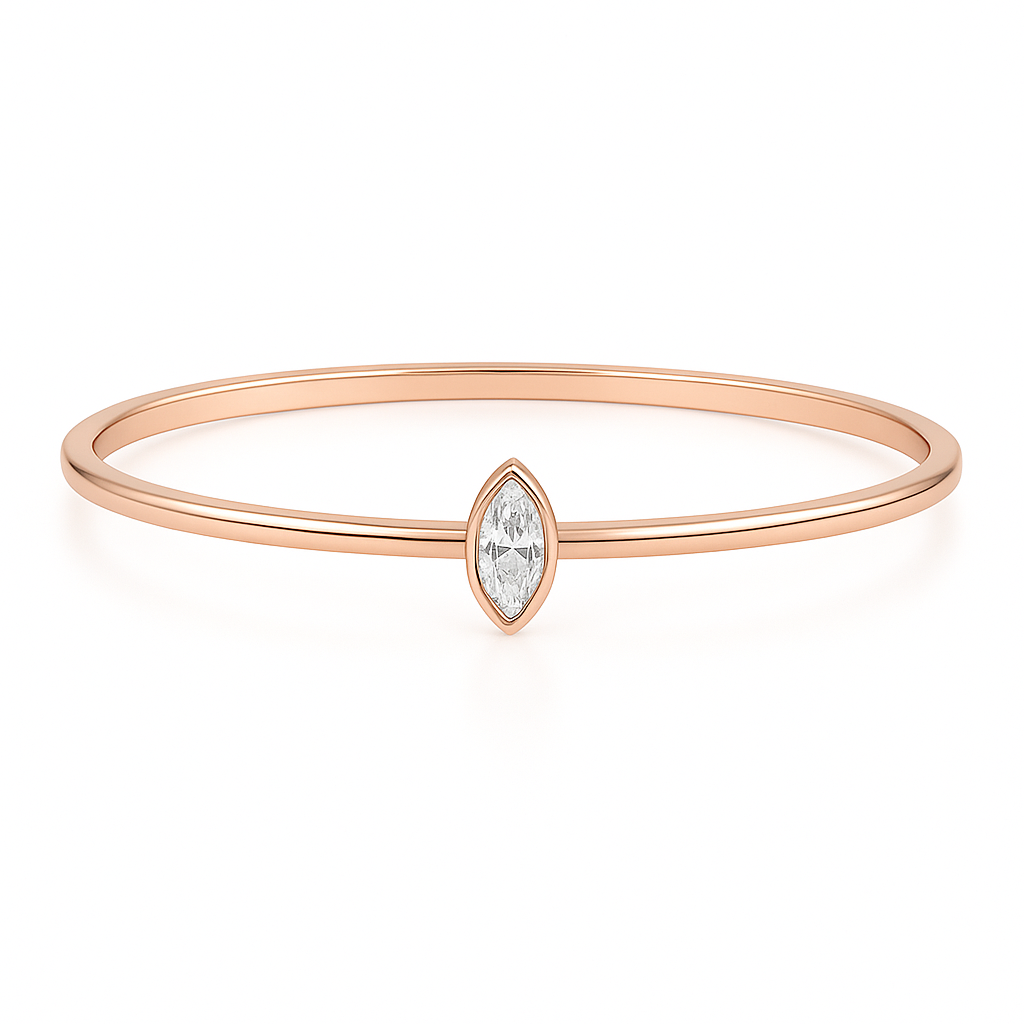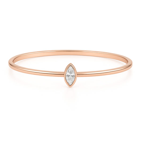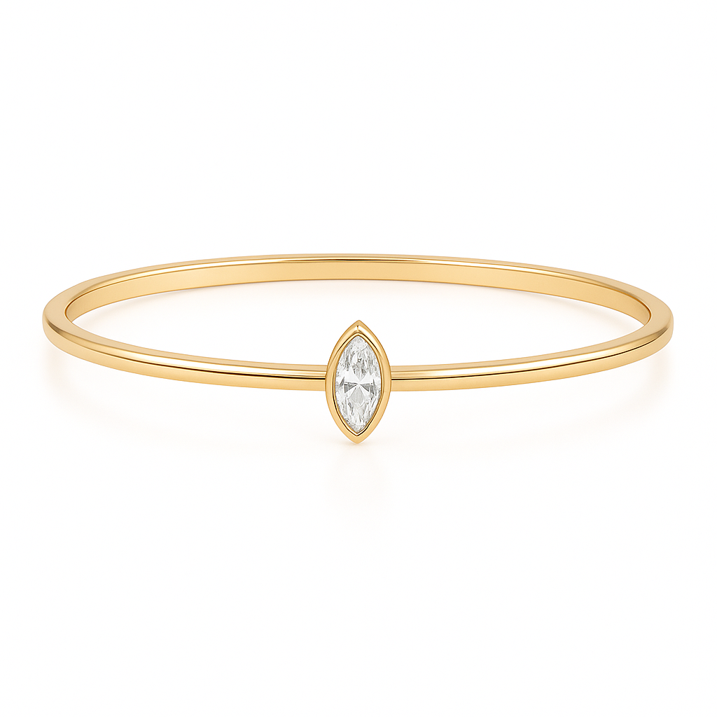 צמיד בנגל מזהב  14K בעיצוב מינימליסטי ויוקרתי, עם יהלום מרכזי בחיתוך מרקיזה המשובץ במסגרת עדינה.