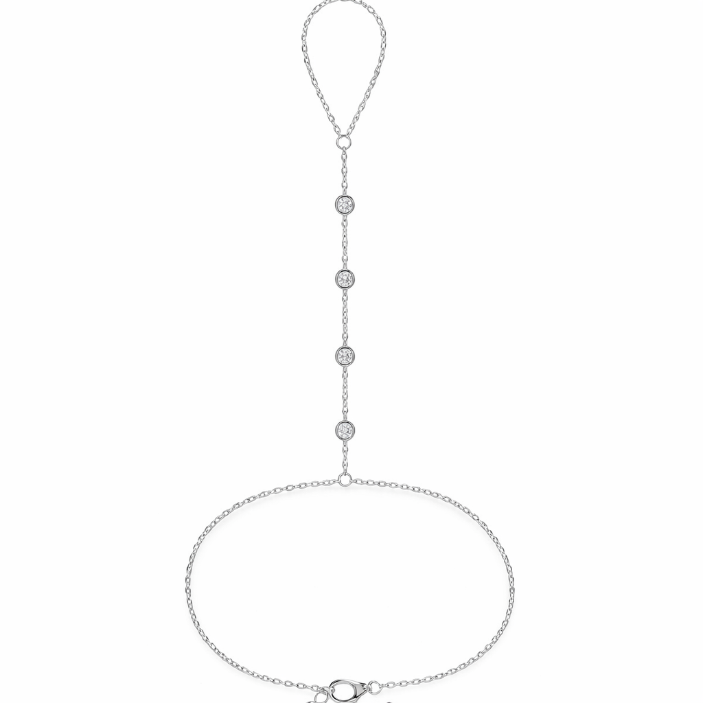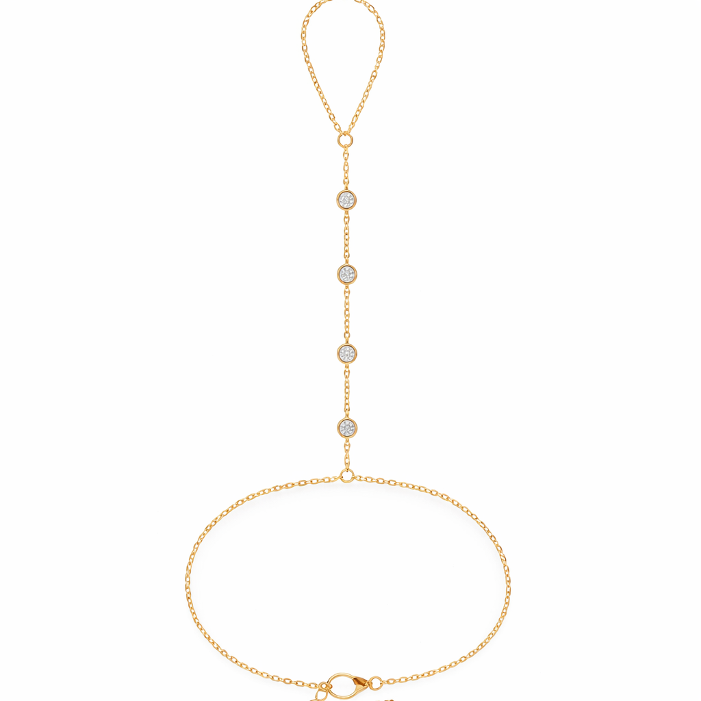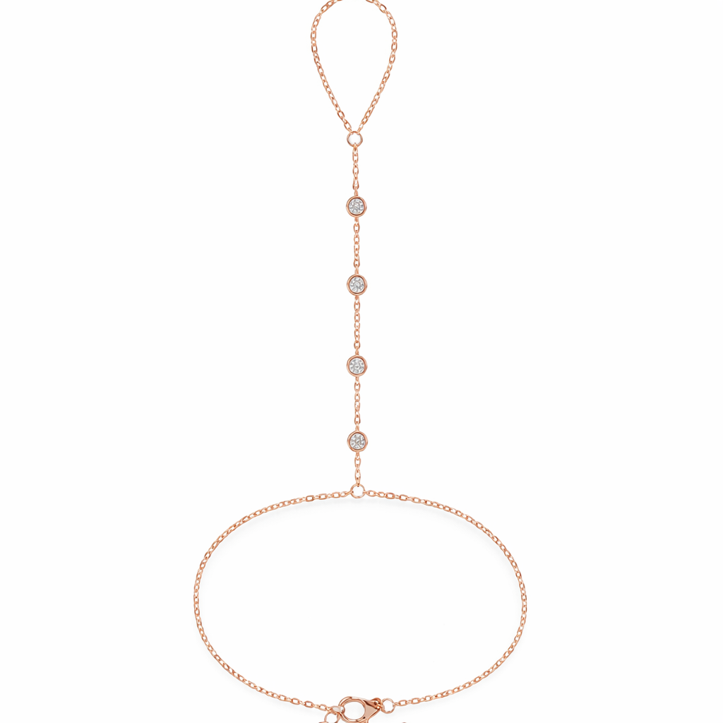 השרשרת הדקה יוצרת חיבור מושלם בין האצבע לפרק היד, כאשר לאורך החוליה המרכזית משובצים 4 יהלומים עגולים המעניקים ברק נקי ומתוחכם.