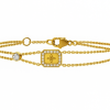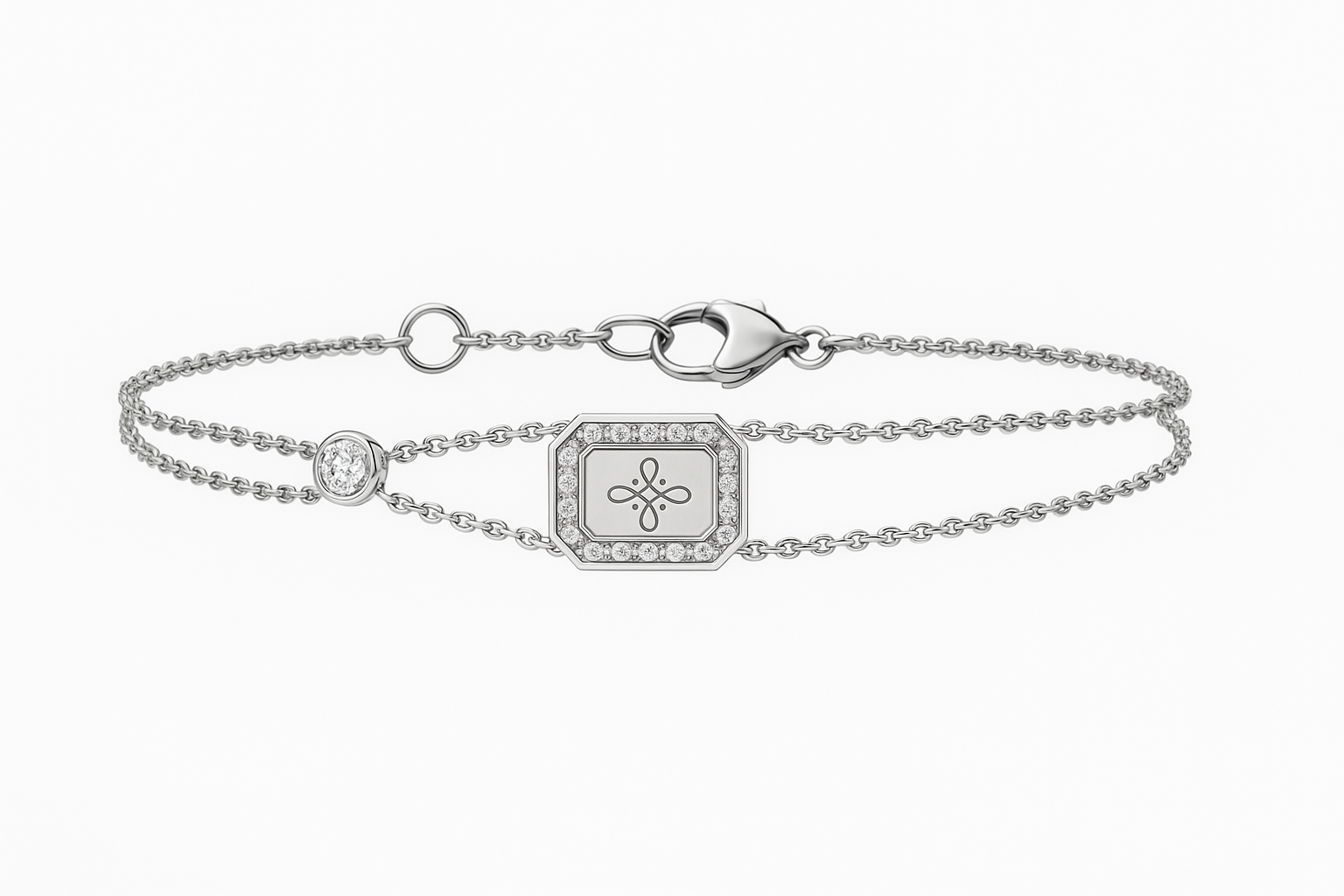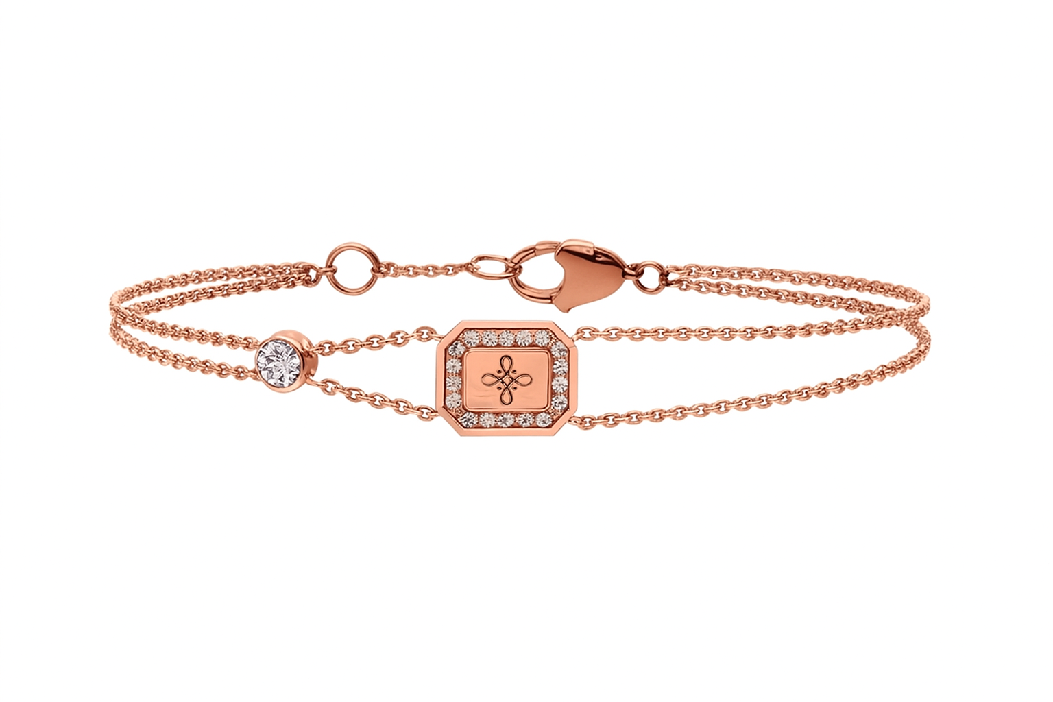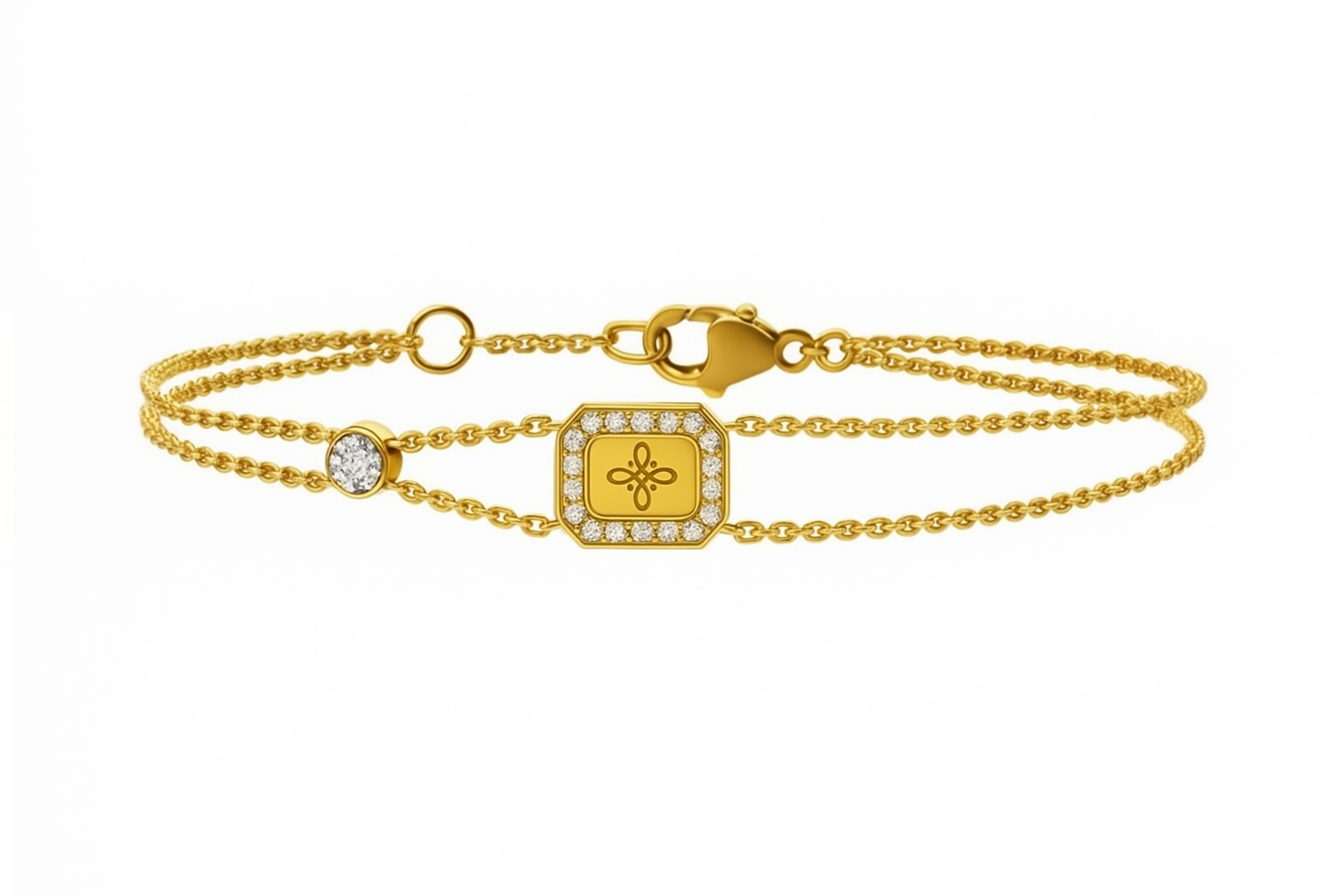 צמיד עדין ואלגנטי עם שרשרת כפולה, עשוי זהב שבמרכזו תליון מתומן משובץ בשורת יהלומים עדינים המקיפים חריטה של סמל אומנותי.
