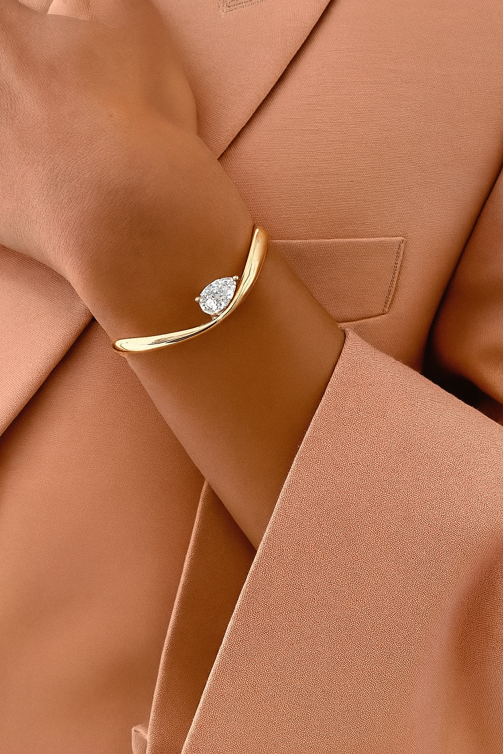 צמיד זהב קשיח המעוצב בסגנון יוקרתי ומרשים שמשובץ במרכזו ביהלום 2 קראט מעבדה בחיתוך טיפה.