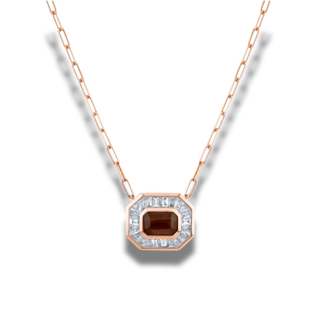 שרשרת אלגנטית וייחודית בעיצוב גאומטרי נקי, עשויה זהב עם תליון משובץ אבן חן חומה בליטוש אוקטגון (מתומן).