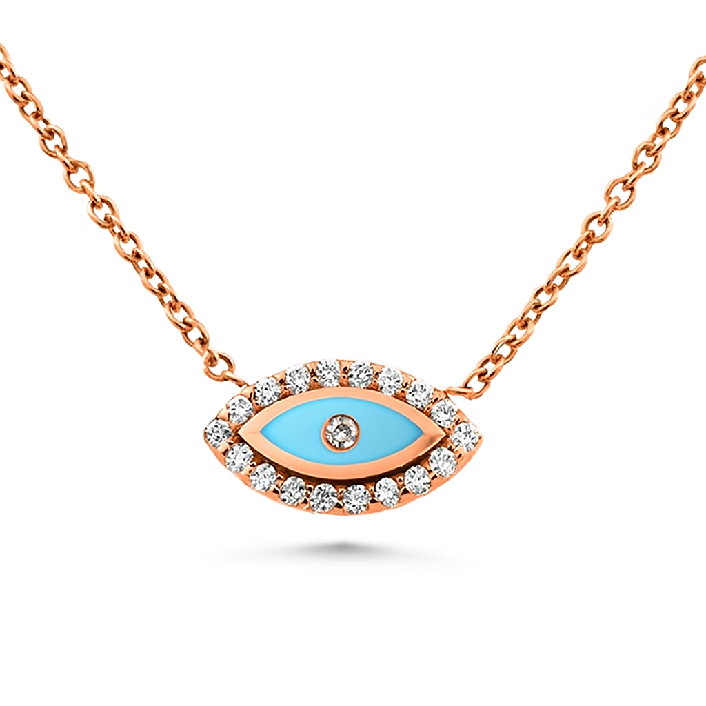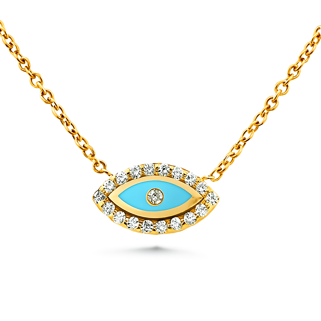 תליון בצורת עין מרוקאי משובץ יהלומי מעבדה במסגרת זהב , ובמרכזו עין מחויטת באמייל תכלת חלק ונקי – סמל של מזל טוב והגנה אנרגטית.