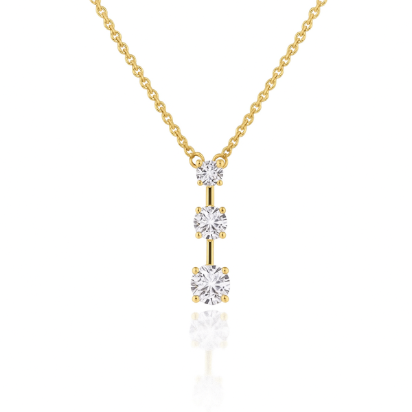 שרשרת יוקרתית עשויה זהב 14K בעיצוב אלגנטי, משובצת בתליון אנכי של שלושה יהלומים עגולים ומבריקים בחיתוך מושלם.