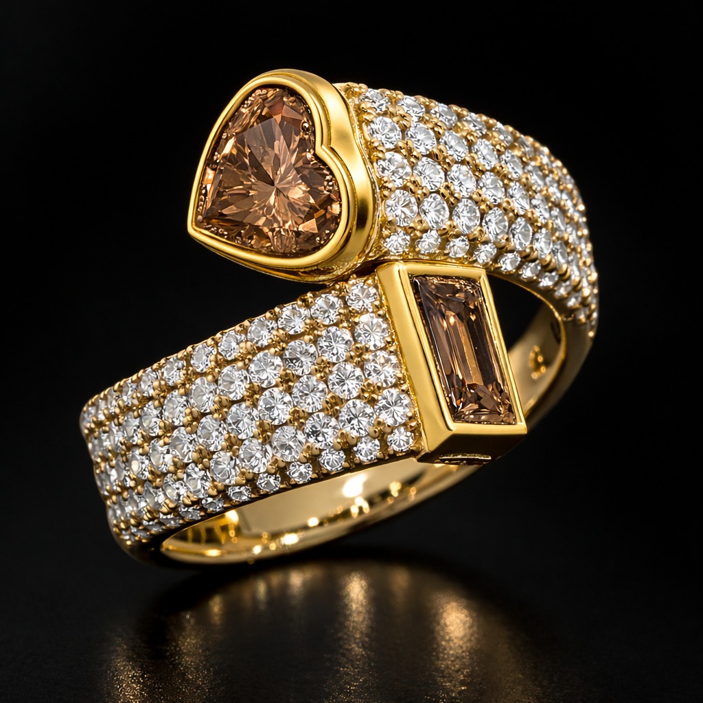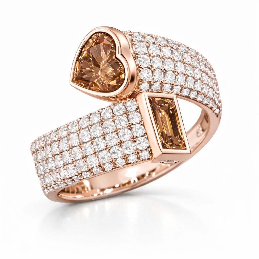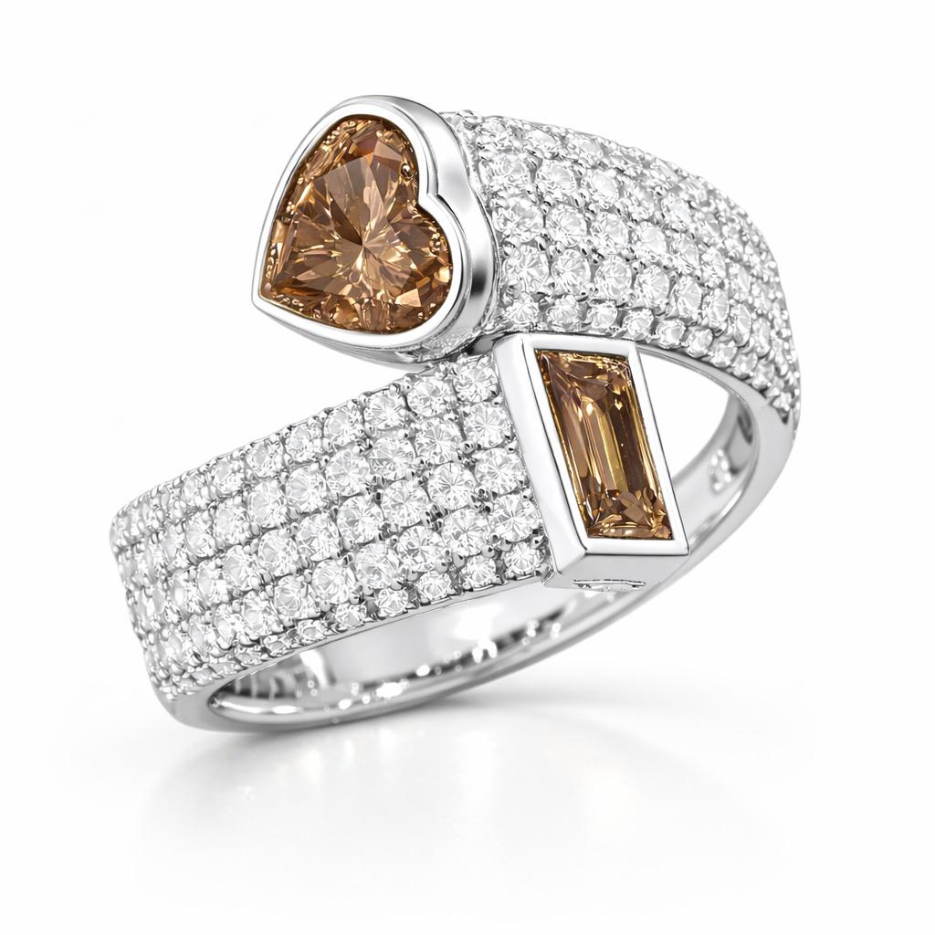 במרכז הטבעת משובצים שני יהלומים בגוון חום יוקרתי – אחד בחיתוך לב והשני בחיתוך מלבני אלגנטי, היוצרים יחד מראה ייחודי ובלתי נשכח.